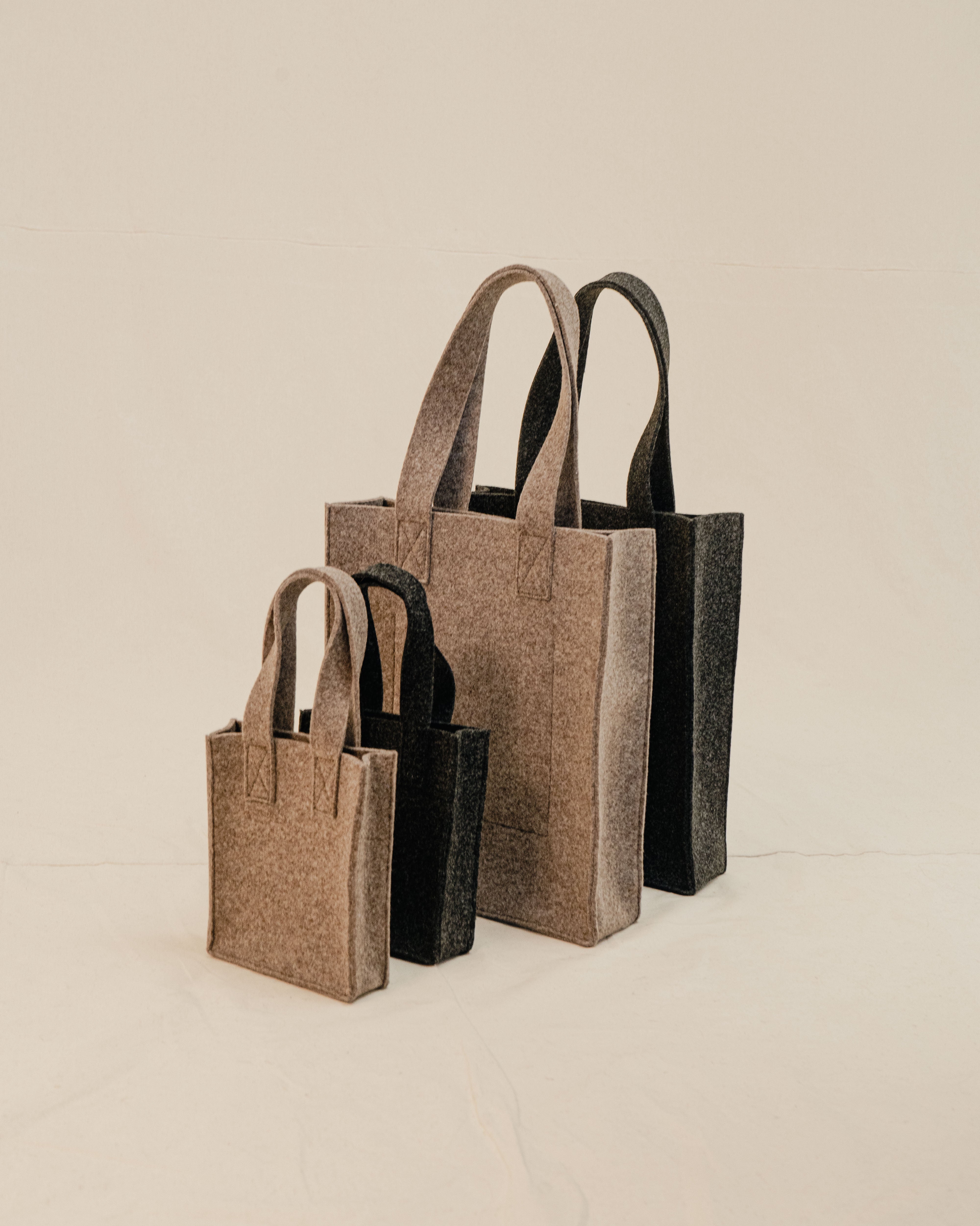The bags are made from a felt created from post-consumer plastic bottles. The large tote rescues 12 used bottles from going into landfill and every small tote gives a new life to three.
