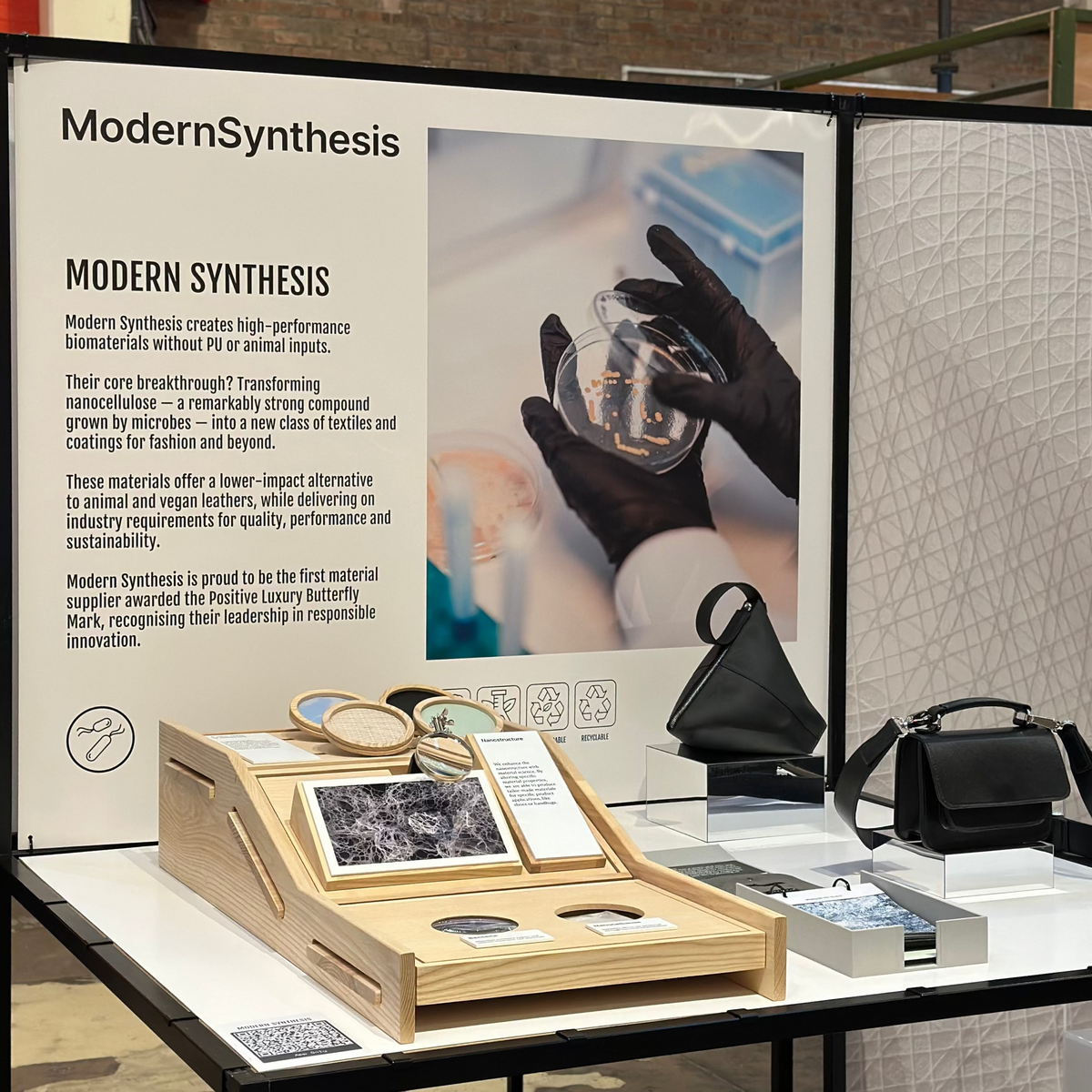 Modern Synthesis is a fellow London-based company bringing to life materials. The company uses material science to transform nanocellulose - a natural byproduct of fermentation - into a new class of responsible textiles and coatings. They not only displace animal leathers and plastic-based textiles, but also generate entirely new textile possibilities for designers.