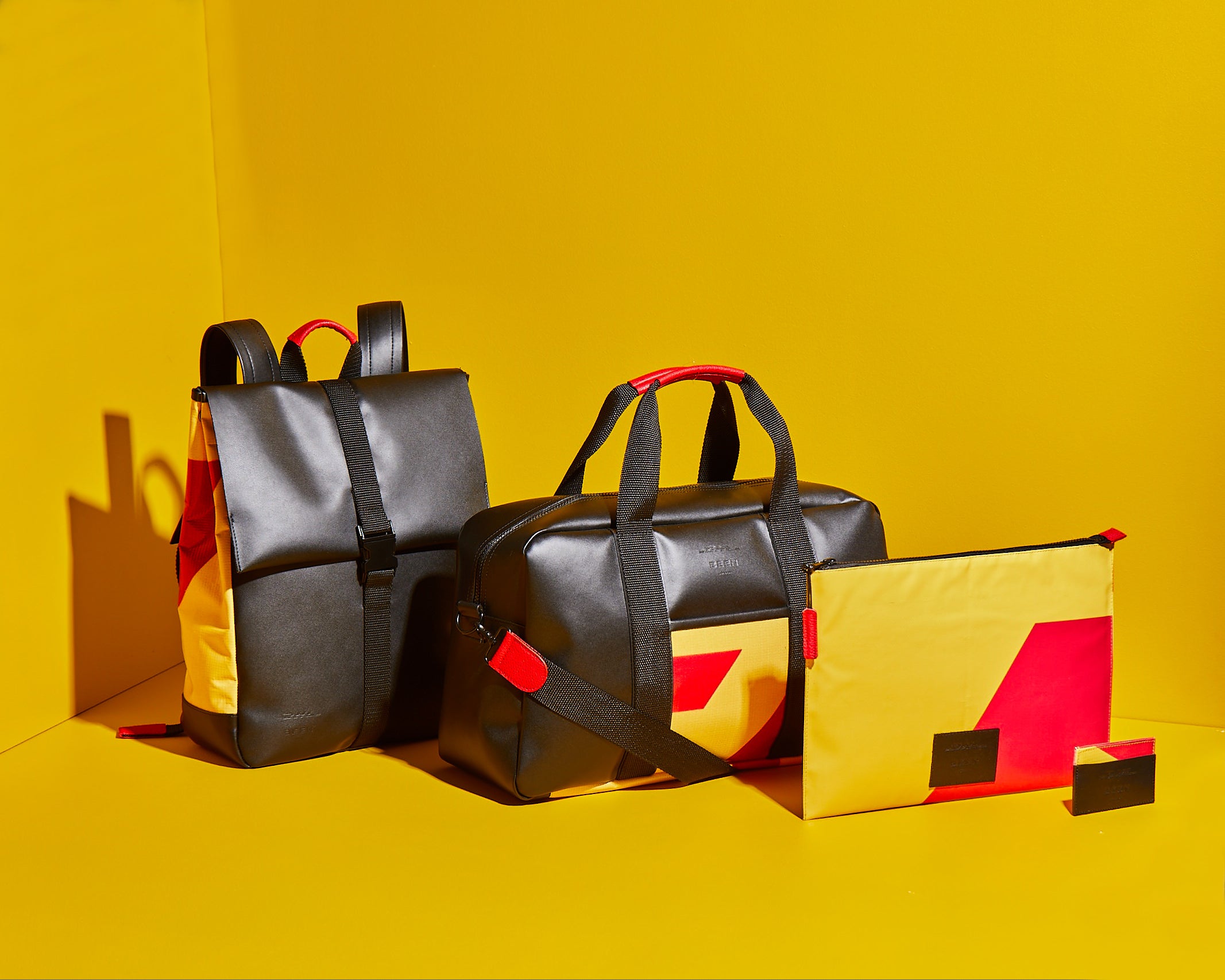 The nature of the banner and the print makes every piece of this limited edition collection completely unique. We combined the bright yellow and red that DHL are famous for with the smooth black textures of our signature recycled materials to create a timeless collection.
